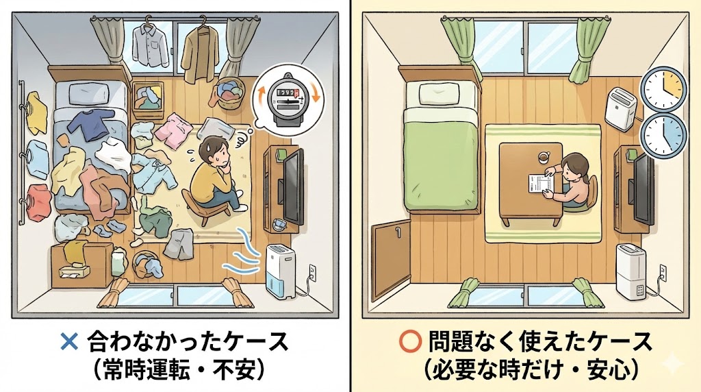 - 家族の中で、電気代の優先度と湿気やにおいへの敏感さのバランスがそろっていない