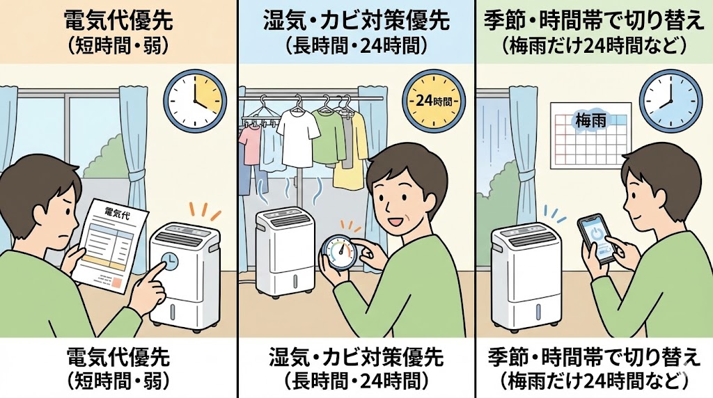 運転パターンを決めないまま毎日なんとなくスイッチを入れていると、電気代の増え方も湿気の残り方も、その日ごとの気分次第になりやすくなります。逆に、「梅雨の時期は夜だけ弱運転でつけっぱなし」「在宅が長い日はタイマーを足す」など、自分なりの組み合わせを先に決めておくと、24時間運転に近い使い方でも迷いがぶり返しにくくなります。