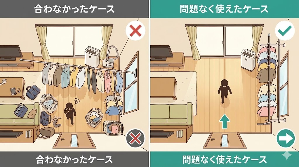 - 部屋干しスペースと通路が重なり、洗濯物と除湿空気清浄機の両方が「邪魔な存在」に感じられやすい