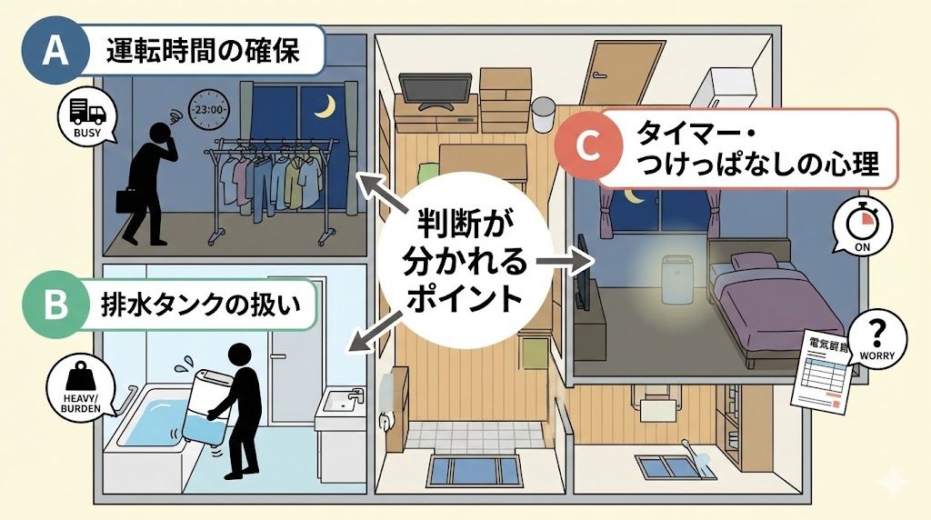 A:電気代の目安を知っておくこと自体は大事ですが、そこで判断を止めてしまうと「帰宅後の時間の余白」や「排水タンクを捨てる動線」といった、使い続けられるかどうかの条件を見落としやすくなります。同じ電気代でも、つけっぱなしにできる時間帯や、日中に動かせるかどうかで負担の感じ方は変わるため、料金だけでなく暮らし側の条件も一緒に並べて考える方が、後からのギャップを小さくしやすくなります。