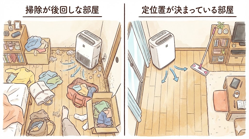 左は床や棚に物が出しっぱなしで、除湿空気清浄機のまわりまで片付けが回らず、ほこりに気づいても近づきにくい配置。右は本体の前後に通路があり、掃除道具も近くにあって「今のついでに手を伸ばせる」配置です。