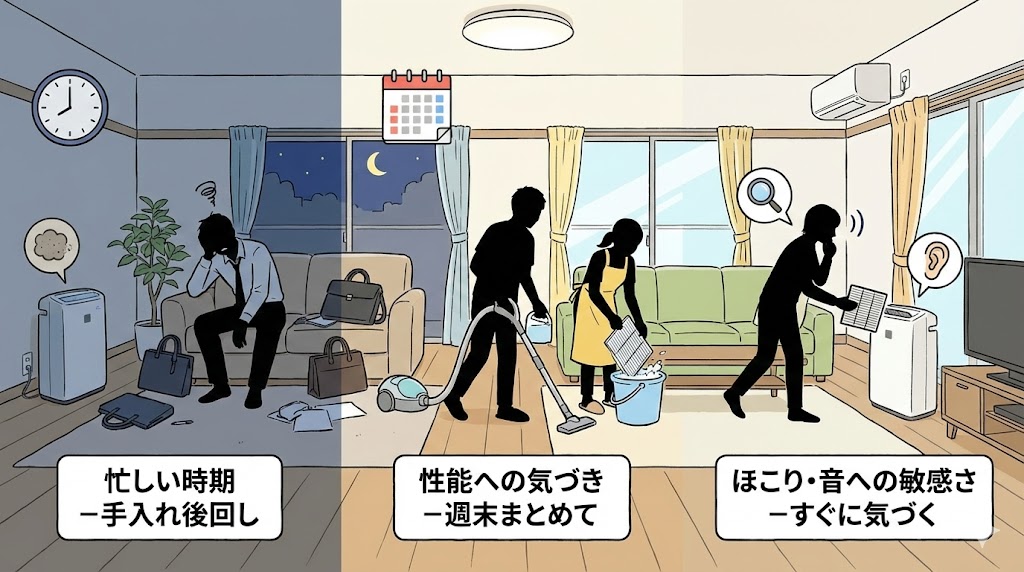 同じように片付けが後回しになりやすい家でも、「どこまでなら気にならないか」「何が変わると不安になるか」は人によってかなり違います。ほこりの見え方、運転音の変化、除湿やにおいの体感など、どのサインを重く受け止めるかで、手入れに向かうペースも変わります。
