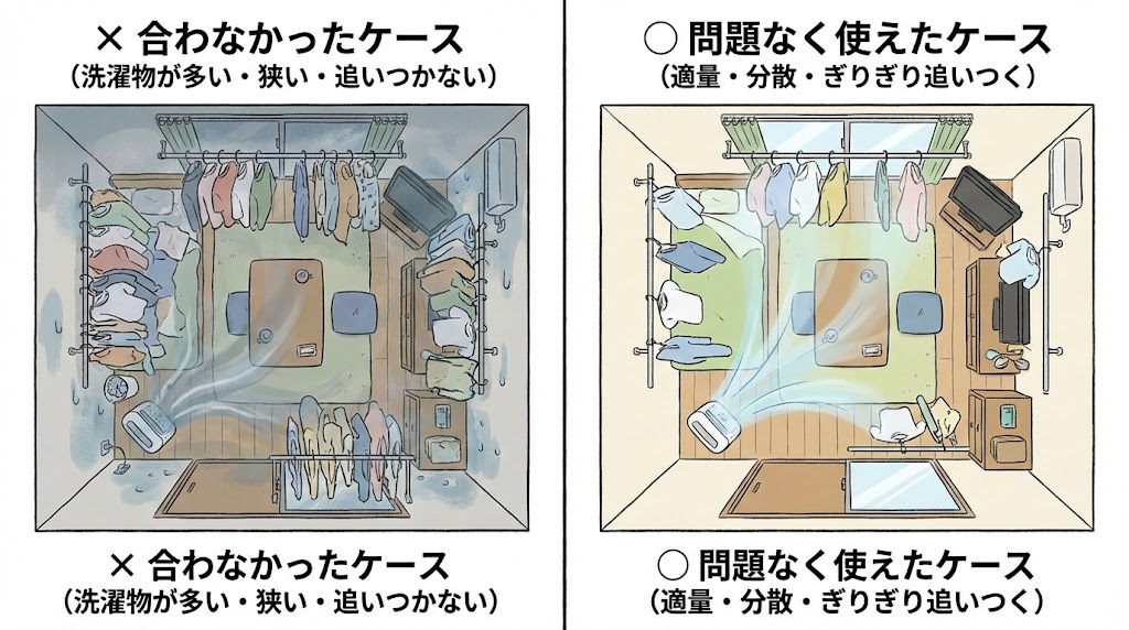 ここでは、洗濯物の量、在宅時間、雨の日や湿気の強さといった条件が組み合わさったときに、どこで「足りない側」と「なんとかなる側」が分かれやすいかを整理していきます。