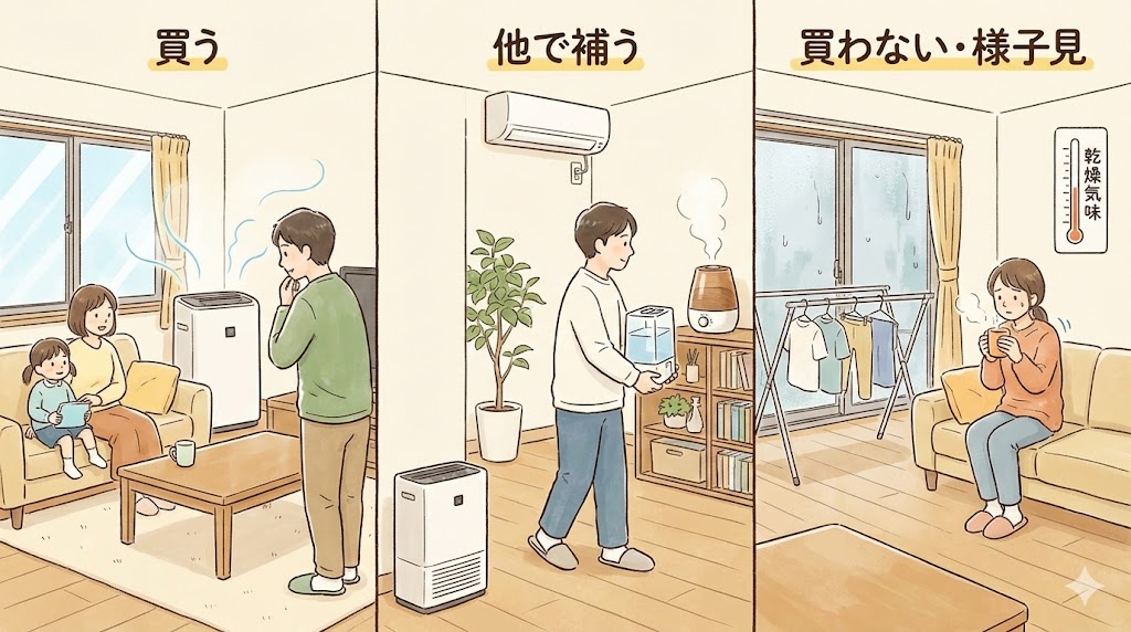ここに出てきたケースでは、「部屋の乾燥がそこまで深刻ではない」「他の対策である程度まかなえる」が揃うと負担が増えやすい。逆に「どうしても加湿まで一体で管理したい理由」がはっきりしていると気になりにくい。