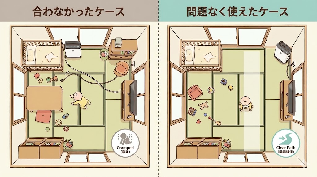 ここに出てきたケースでは、「通路の幅がギリギリ」「コードが床を横切る」「赤ちゃんの遊ぶ範囲と家電が近い」が揃うと負担が増えやすいです。