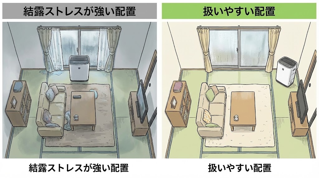 この場合、同じように結露がひどくても、「湿度を少し高めに保ちたい気持ち」との折り合いがつきやすくなります。