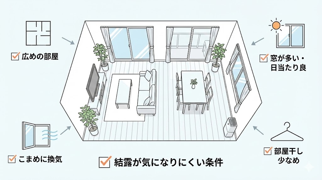 - 結露は出ても「まあ許容できる」と感じやすい使い方や住環境