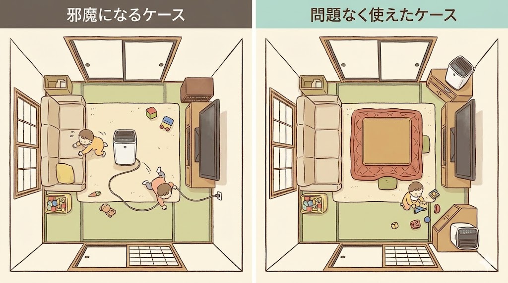 こうした配置では、つまずきそうな場面が続くと、スイッチを切ったり、本体を一時的に別の部屋へ移動させたまま戻さなくなる人もいます。通路の途中で足が止まる感覚が強いほど、「せっかく置いたのに、また片付けてしまった」という気持ちになりやすくなります。