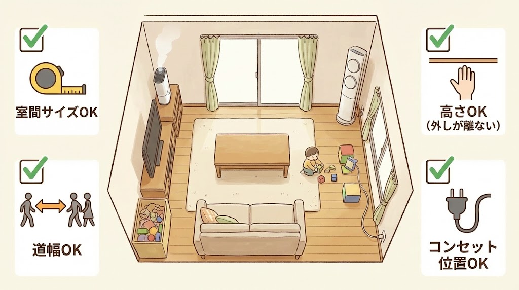 ここまでのケースを並べると、加湿空気清浄機の置き場所で迷いやすいのは、「子どもの動線」「床置きと高さ」「動かす手間」が重なるところにあることが見えてきます。同じ部屋でも、どこを通路とするか、どこを遊び場とするかによって、邪魔さや不安の感じ方はかなり変わります。