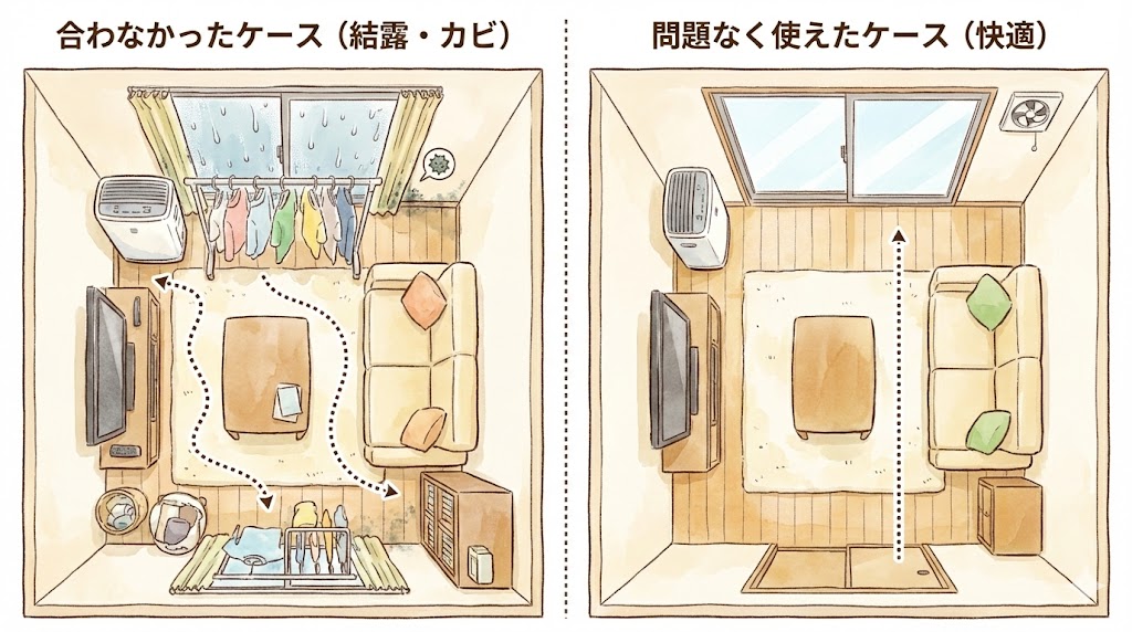 結露やカビがまったく気にならない人ばかりではなく、「心配はあるけれど、運び方次第でなんとか折り合いがついた」と感じるケースもあります。ここでは、乾燥と結露のあいだで悩みつつも、「これなら続けられそう」と落ち着いた人の条件を見ていきます。