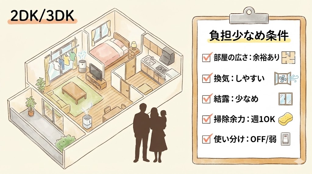 在宅時間や家族構成、部屋の広さなどによって、「中間ライン」に置ける条件は変わります。時間に余裕がない人は、「加湿OFFや弱モードを切り替える余力があるかどうか」が境界線になりやすく、掃除や換気に手をかけられる人は、「多少結露が増えても、定期的にリセットできるかどうか」が基準になりやすいです。この違いが、そのまま「足すか・見送るか」の分かれ目になっていきます。