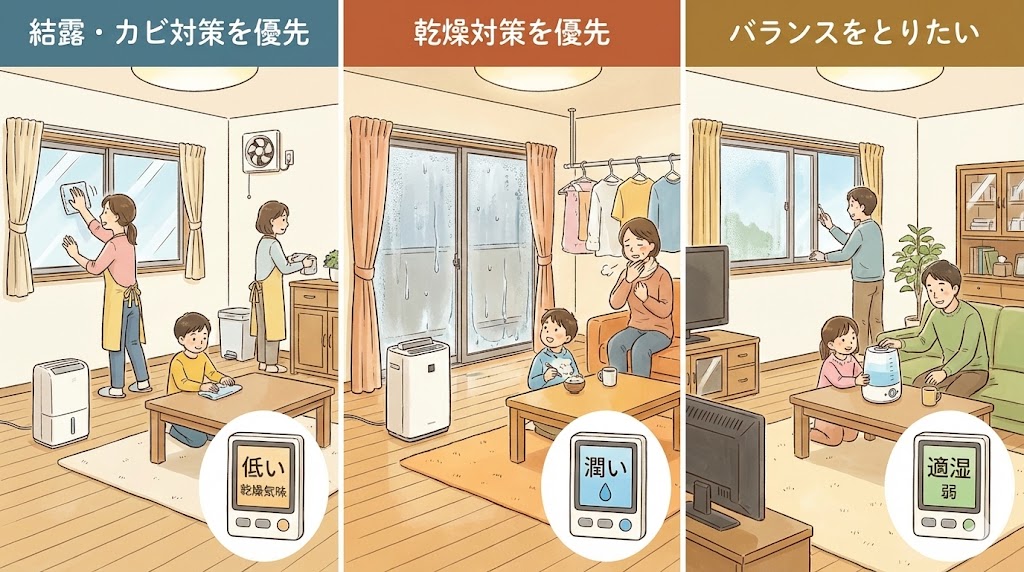ここまでのケースを踏まえると、「足したほうが楽になる人」と「現状維持や別の方法を選んだほうが落ち着く人」のあいだには、いくつかの境界線が見えてきます。ここでは、結露と乾燥のどちらをどこまで許容できるか、運用バランスを含めて考えるときの分かれ目を整理します。