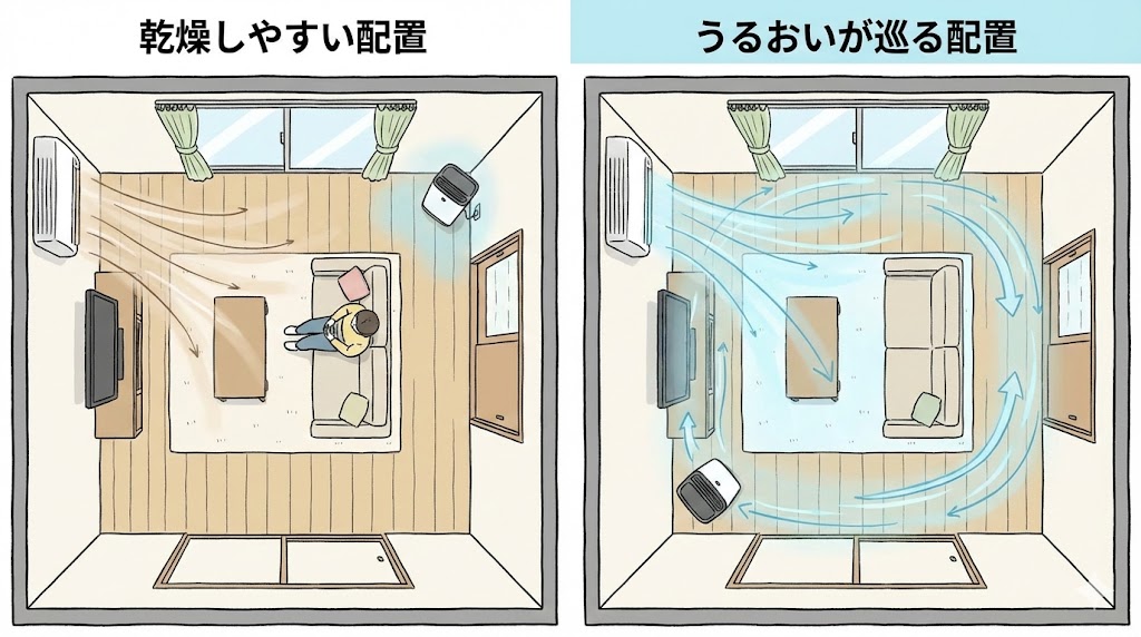 左はエアコンの温風が長時間同じ場所に当たり続け、加湿空気清浄機のうるおいが届きにくい配置。右は風の通り道の途中に加湿が入り、部屋全体に湿り気が回りやすい配置。