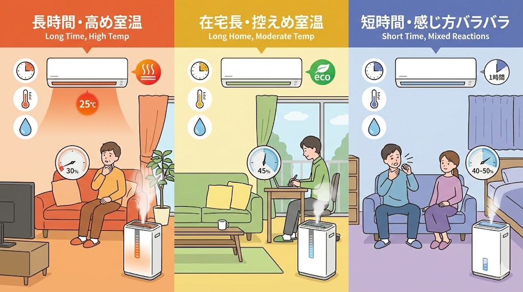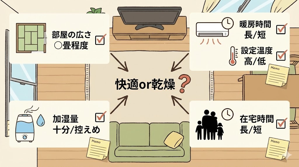 • 室温・運転時間・加湿量の組み合わせで迷いが分かれやすいポイント