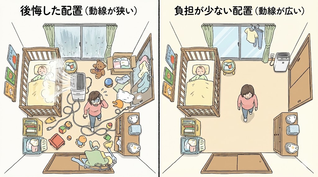 左側はベビーベッドのすぐそばに本体やコードが入り込み、夜中に歩くたびに足元を気にし続ける配置。右側は通路と寝るスペースが分かれていて、親子とも動きやすさを保ちながら加湿している配置です。