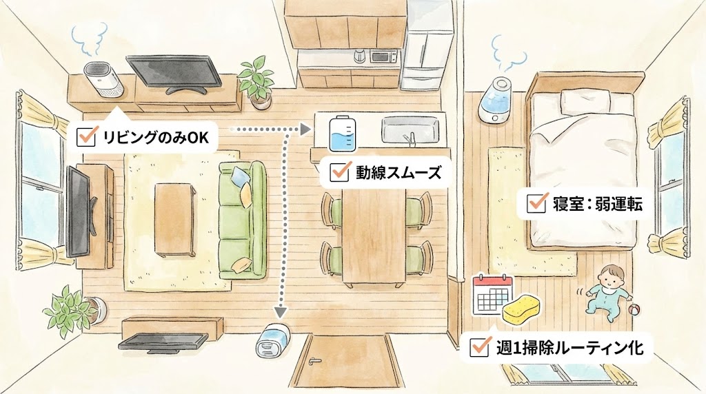 子育て中に加湿空気清浄機を足すとき、ポイントになるのは「どの部屋で」「どの時間帯に」「どのくらいの手入れなら続けられそうか」という三つの条件が、自分の生活とどれくらい重なるかです。
