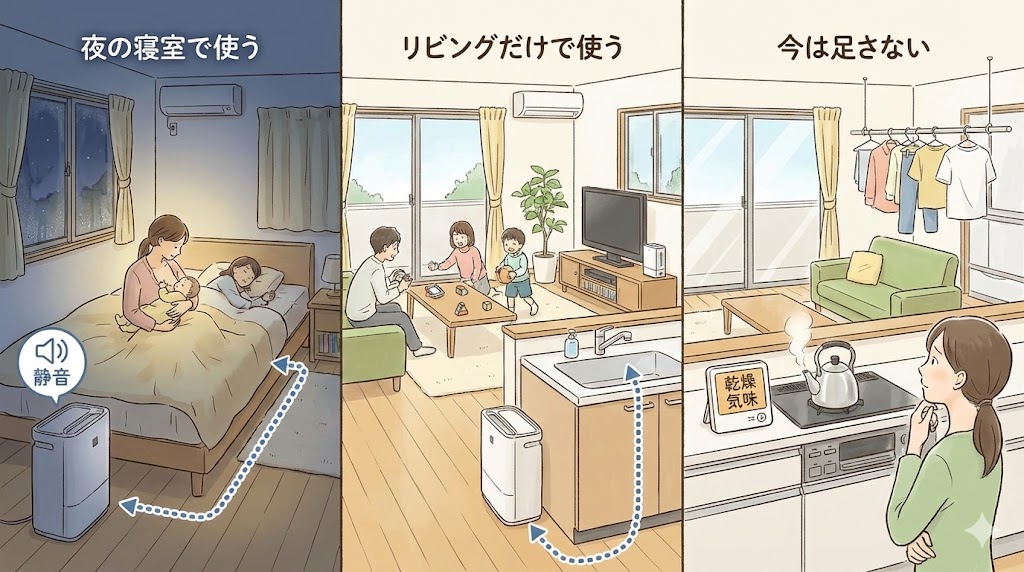 ここに出てきたケースでは、「今の部屋の乾燥の強さ」「過去のカビの経験」「子どもの体調への不安」がどれだけ強く重なっているかが、すぐに足すか、いったん見送るかの分かれ目になりやすいです。どれか一つでも軽いと感じるなら、他の対策を試しながら決める余地も残りやすくなります。