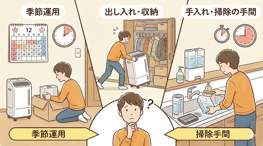 A:まずは「年間でどのくらいの期間・どの部屋で使いたいか」をざっくり想定し、次に「オフシーズンにどこへしまうか」と「給水やフィルター掃除をどの家事のついでに行うか」を決めておくと、置物化しやすい条件を減らしやすくなります。これらが具体的にイメージできない場合は、いったん買わない選択を含めて、他の対策との組み合わせを見直す余地があると言えます。